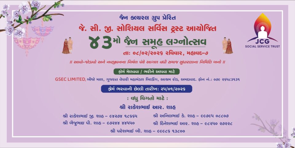 GUJARAT, AHMEDABAD | 18th JANUARY 2026 — Inspired by Jain Welfare Group and organized by J. C. G. Social Service Trust, the 43rd Jain Mass Marriage Festival has been organized to promote the spirit of social service and collective well-being.
