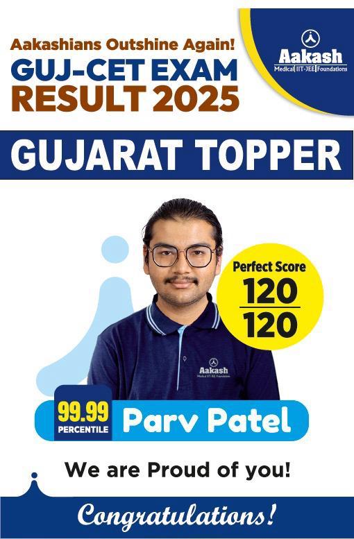 Gujarat 10 May 2025: Aakash Educational Services Limited (AESL), the national leader in test preparatory services, proudly announces the outstanding achievement of Parv Patel, who secured a perfect score of 120/120 and achieved the highest 99.99 percentile, emerging as the Gujarat topper in the GUJ-CET Exam Result 2025.
