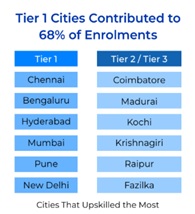68% of enrolments in long-term courses came from professionals in Tier-1 cities, with most demand coming from cities such as Chennai, Bengaluru, Hyderabad, and others. Upskilling demand in Tier-2 cities was strongest in Coimbatore, Madurai, Kochi, and other emerging locations.