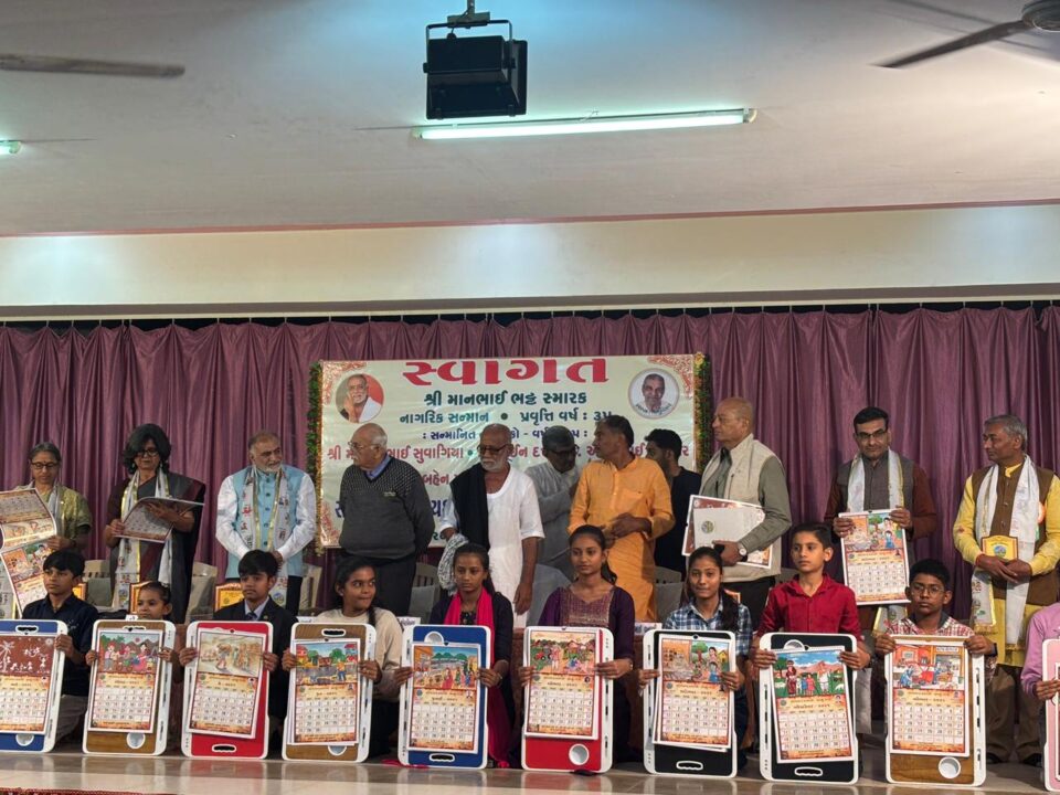 On the occasion, the illustrated calendar for 2026, titled “Shramnu Gaurav” (Dignity of Labour), designed to integrate the values associated with the centenary of “Vande Mataram” with early childhood education, was released, featuring artwork by 12 child artists. The new training building of Shishuvihar was also inaugurated by Morari Bapu.