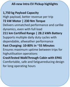 Joining the Ace EV 1000 and Ace Pro EV, the Intra EV Pickup strengthens Tata Motors’ comprehensive electric small commercial vehicle portfolio—built to support India’s entrepreneurs, drivers and fleet owners in building more efficient businesses and a more sustainable future.